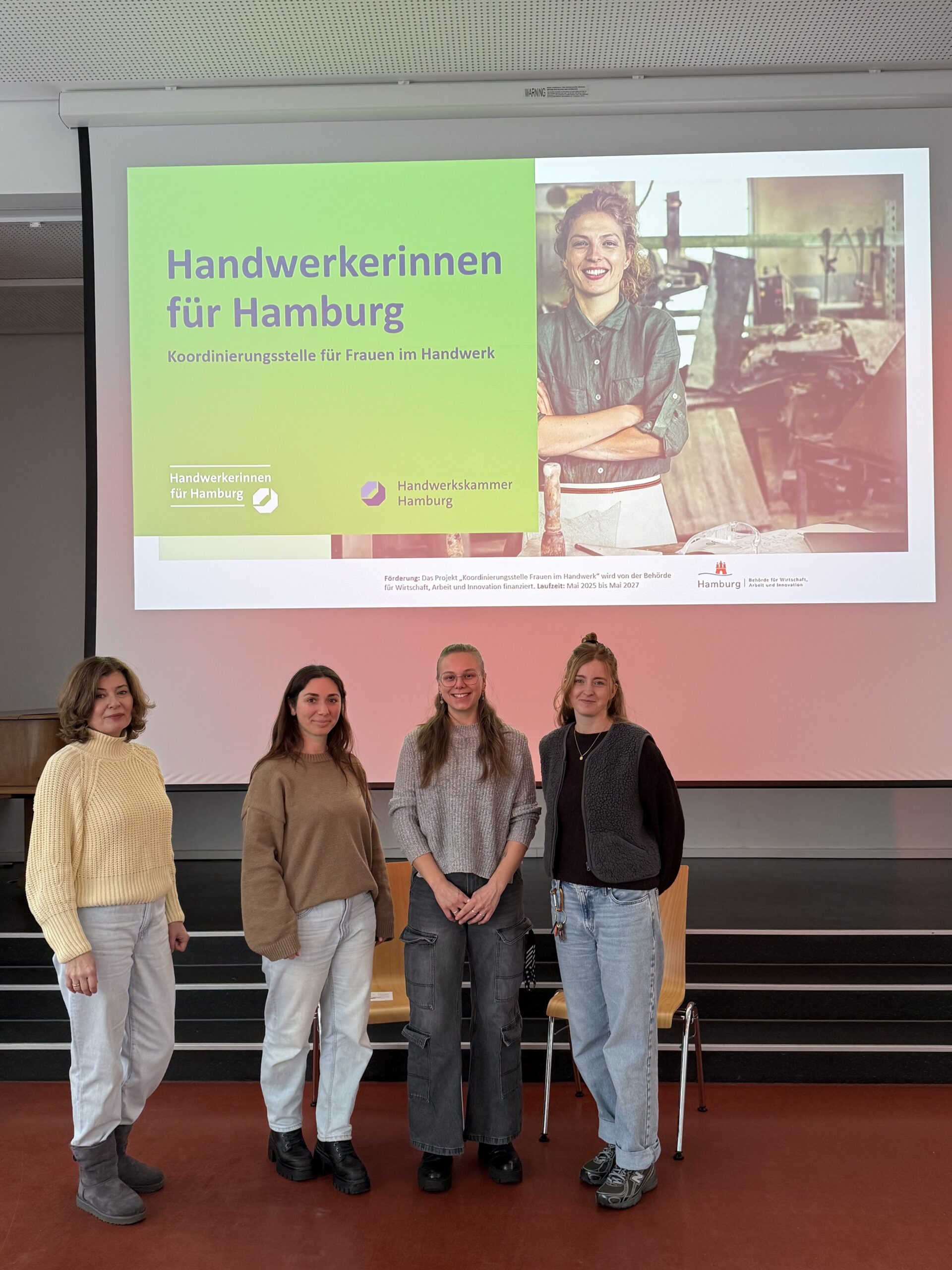 Vor Kurzem durften wir besonderen Besuch an unserer Schule begrüßen: Frau Thyen, Frau Hoffman sowie Frau Schwegmann – ehemalige Schülerin unserer Schule – von der Handwerkskammer Hamburg waren bei uns zu Gast. Gemeinsam stellten sie den Schülerinnen ein spannendes Mentoren- und Coaching-Programm speziell für weibliche Auszubildende im Handwerk vor. Organisiert und koordiniert wurde das Event von unserer Verbindungslehrerin Frau Sahin.