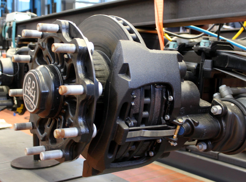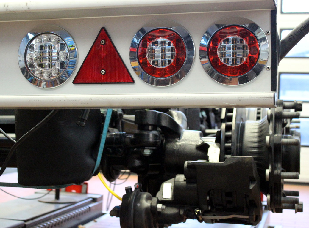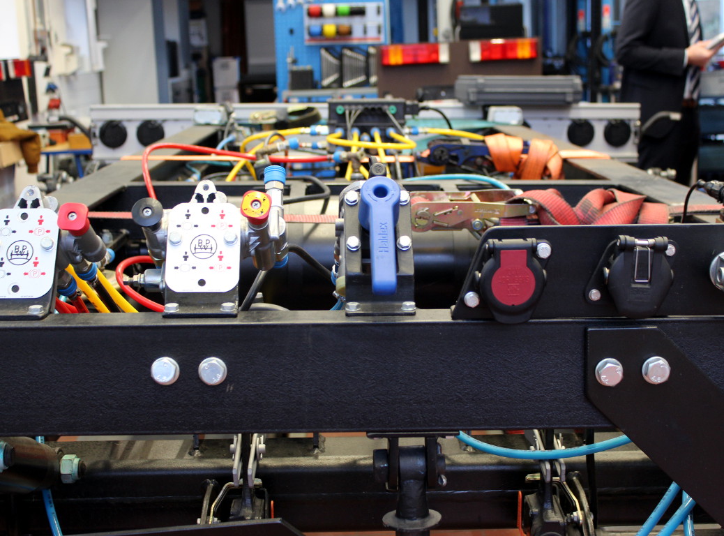 Diese Achszusammenstellung bietet Trommel- und Scheiben-Bremsen an einem Trailer. Sie bieten dem Ausbilder so ein breites Spektrum an technischen Bauteilen und den damit verbundenen Wartungsarbeiten. Alle Achsen sind luftgefedert und mit einem elektronischen Bremssystem (ESB) ausgestattet. Ergänzt wird das Modell durch eine moderne LED-Lichtanlage.