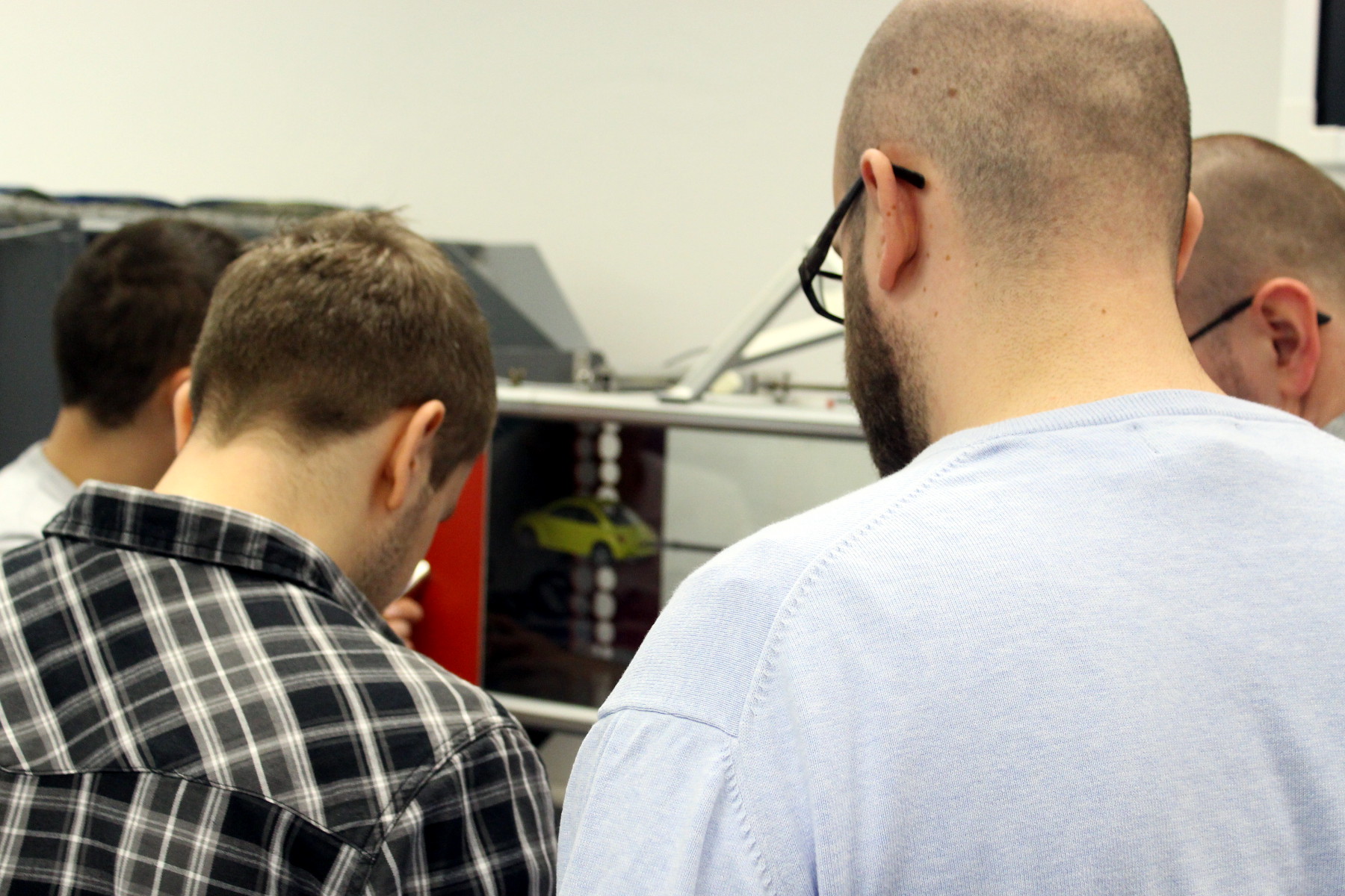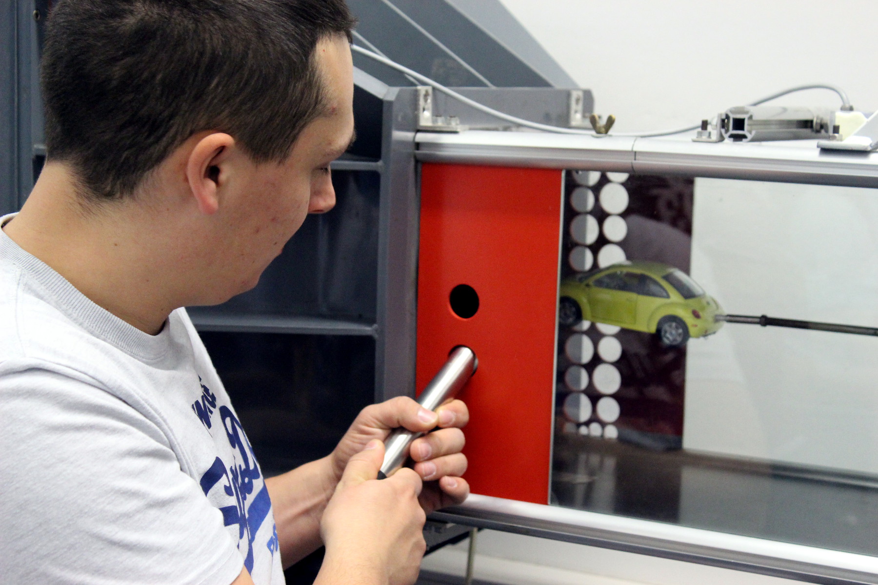 Zuvor führten die Technikerschüler unterschiedliche Versuche im Scholl-Lab durch: Messungen zur schrägen Anströmung von Tragflächen und die Ermittlung des cw-Wertes von Fahrzeugmodellen im Maßstab 1:18 gehörten dazu. Außerdem konnten Sie im so genannten Seifenfilmkanal die Wirbelbildung an unterschiedlichen (Karosserie-) Formen in Augenschein nehmen.